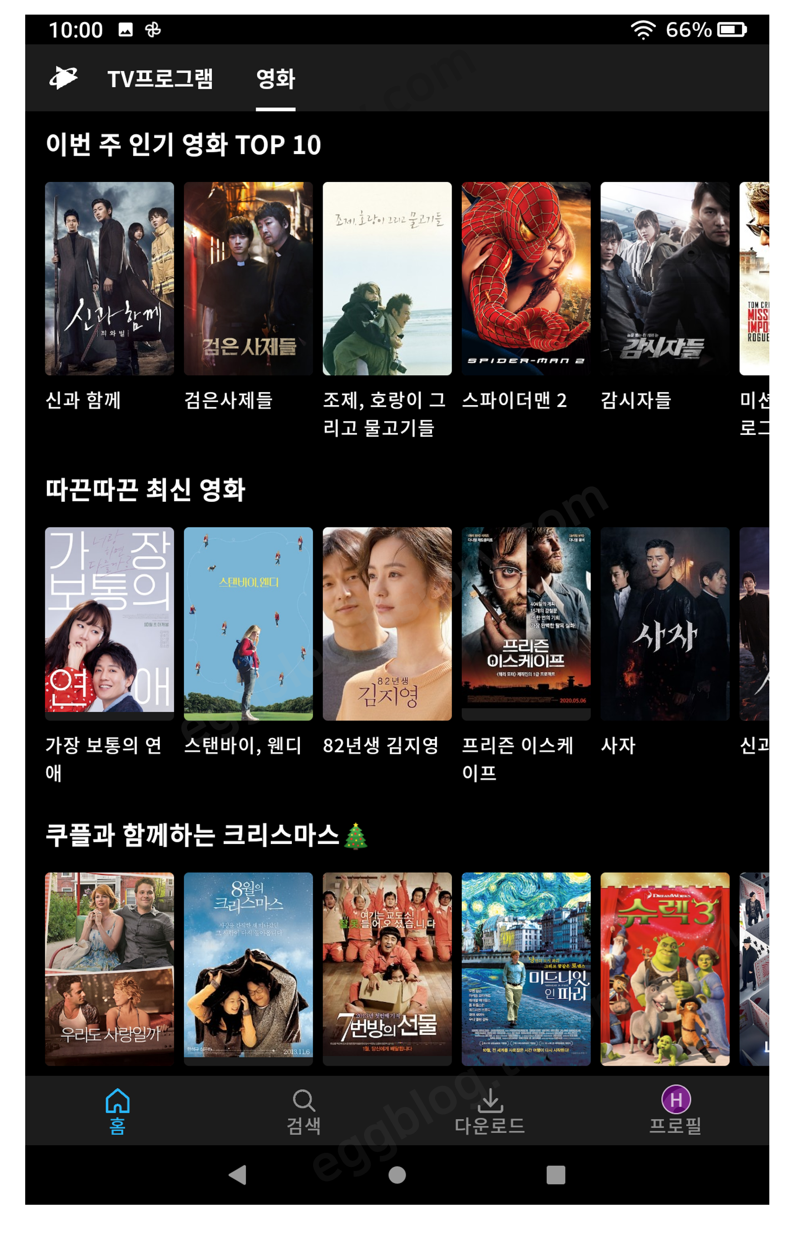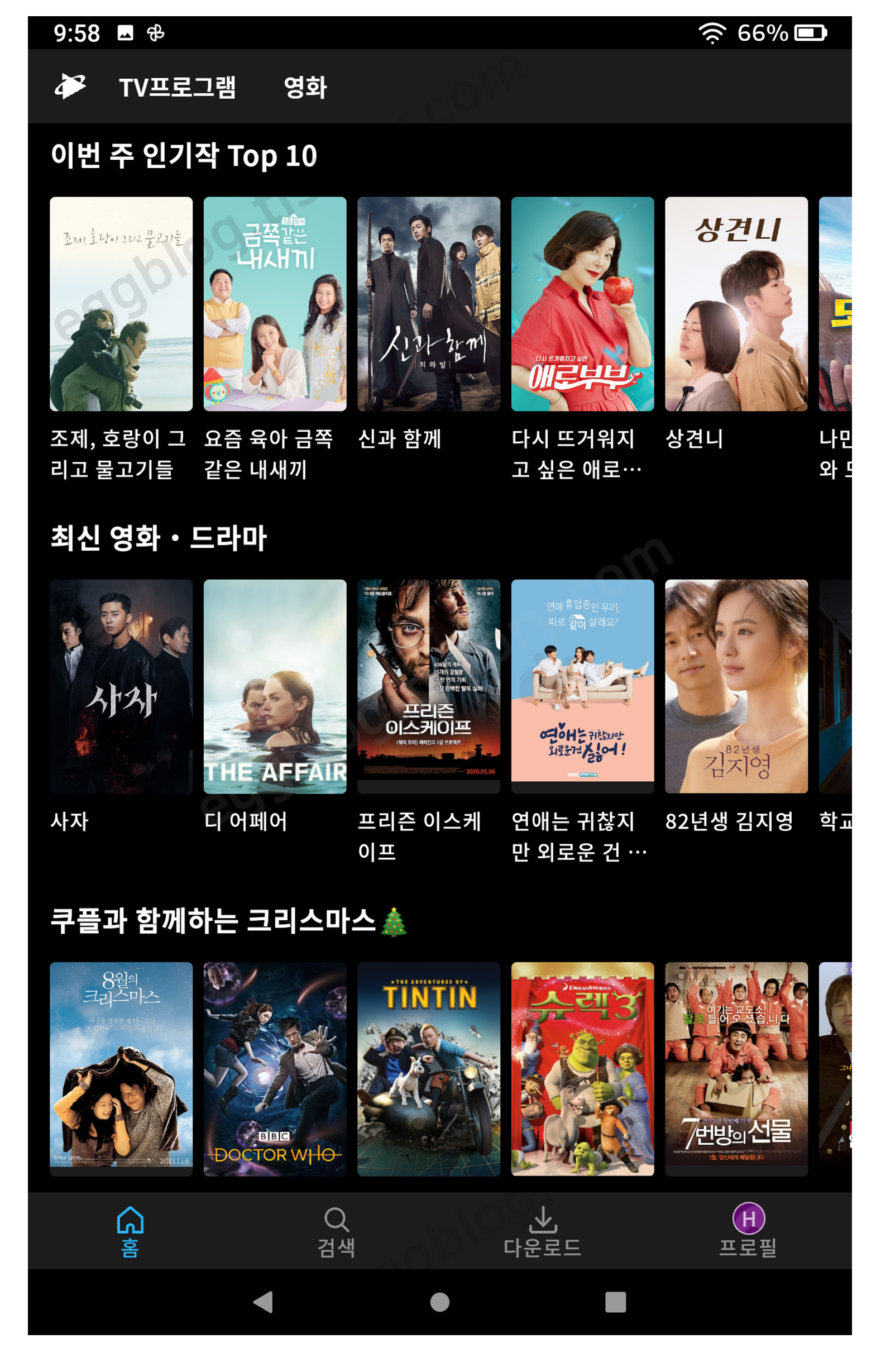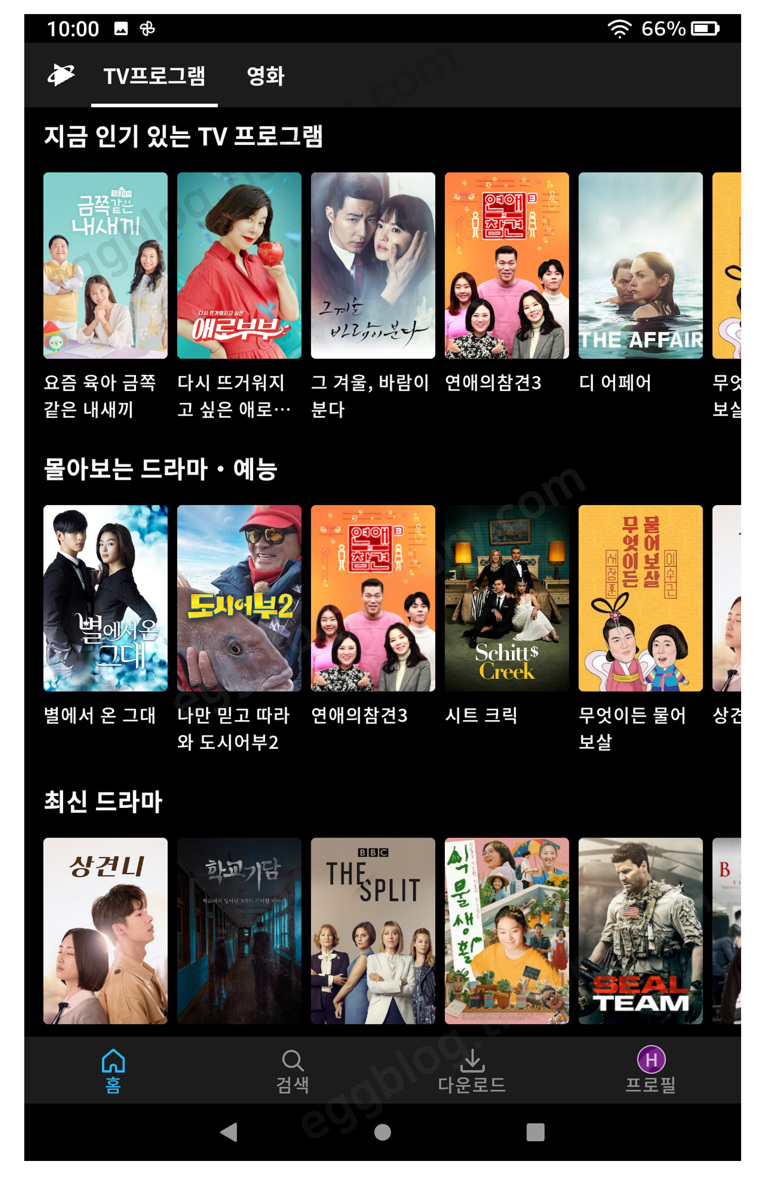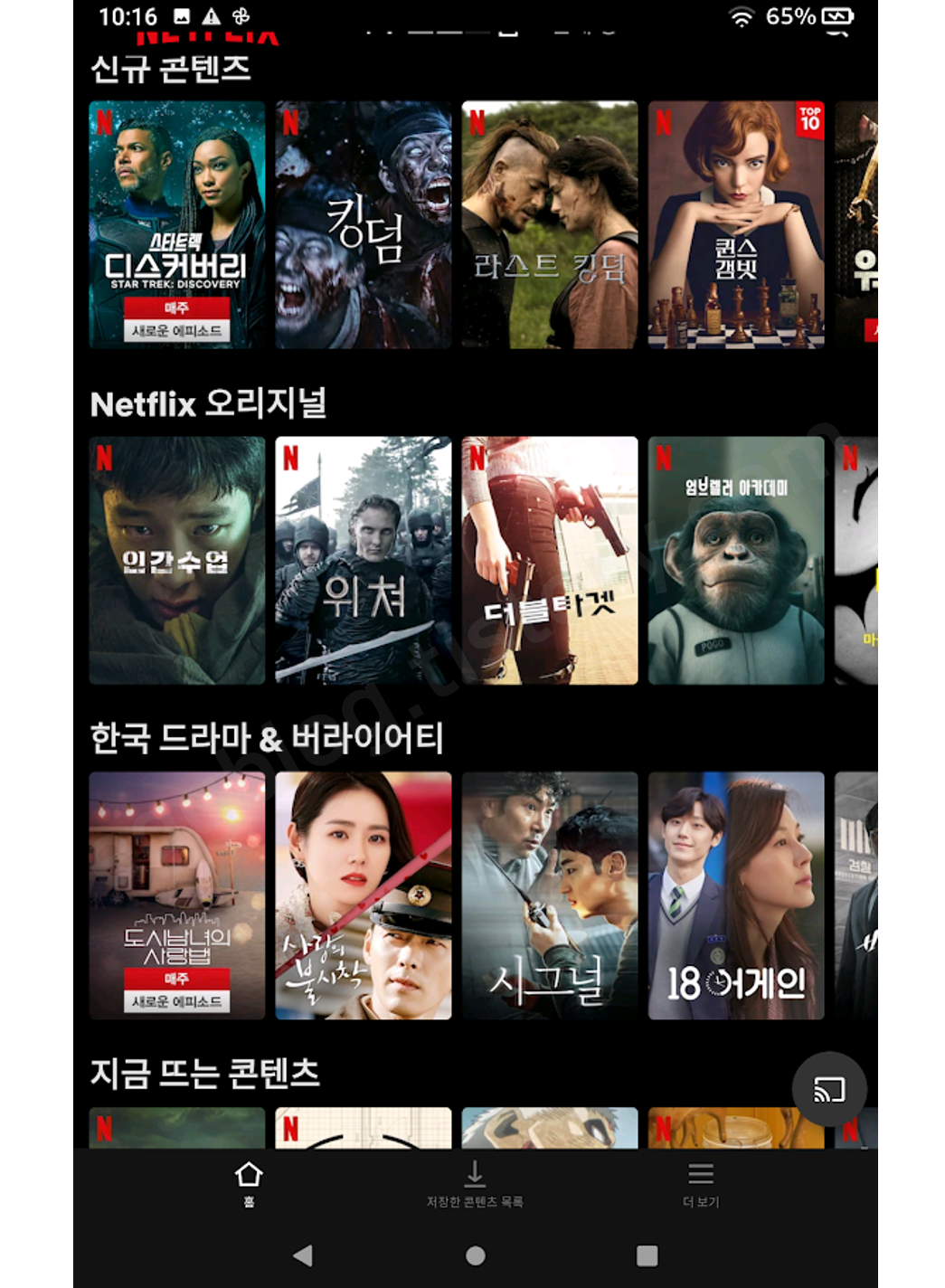 넷플릭스와 비슷하게 TV 프로그램, 영화 기준으로 보여주지만 현재 장르별로 콘텐츠를 정렬해주는 기능은 없습니다.