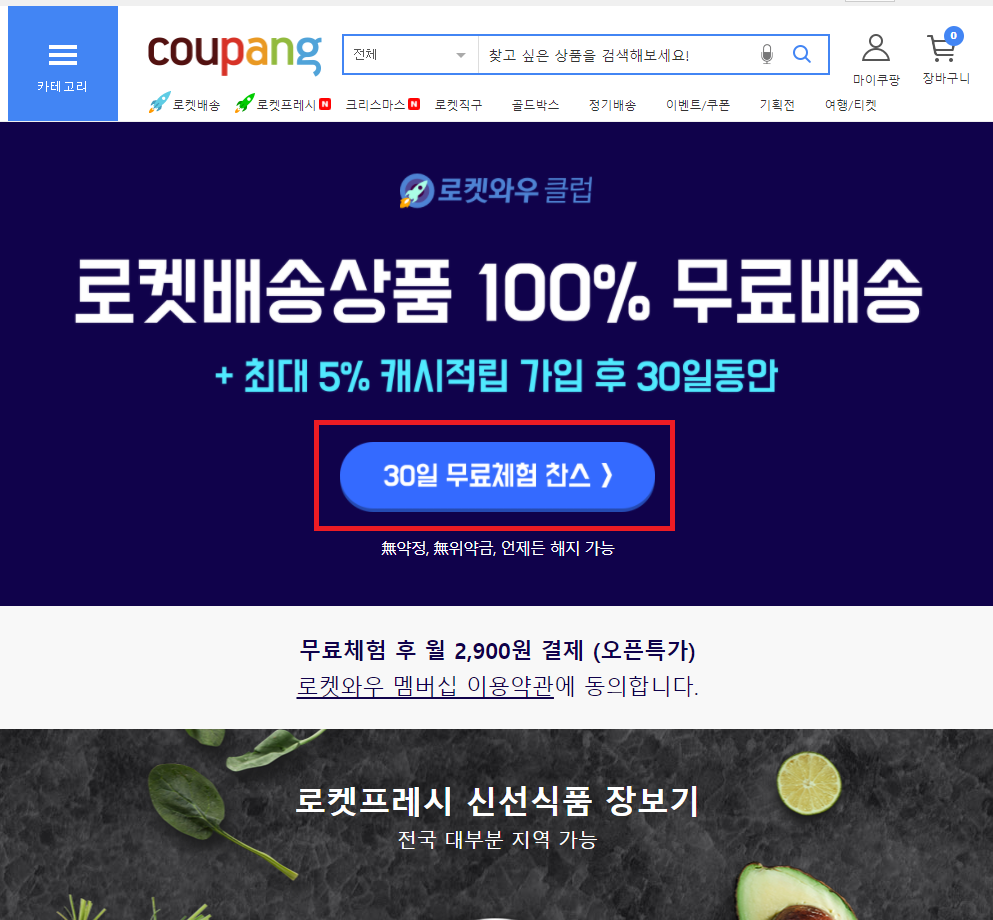 쿠팡 로켓와우는 신규 고객은 30일간 무료로 체험 가능합니다. 또한 로켓와우를 이용하면 쿠팡 플레이도 무료로 이용 가능하니 체험 후 결정하면 좋습니다.
