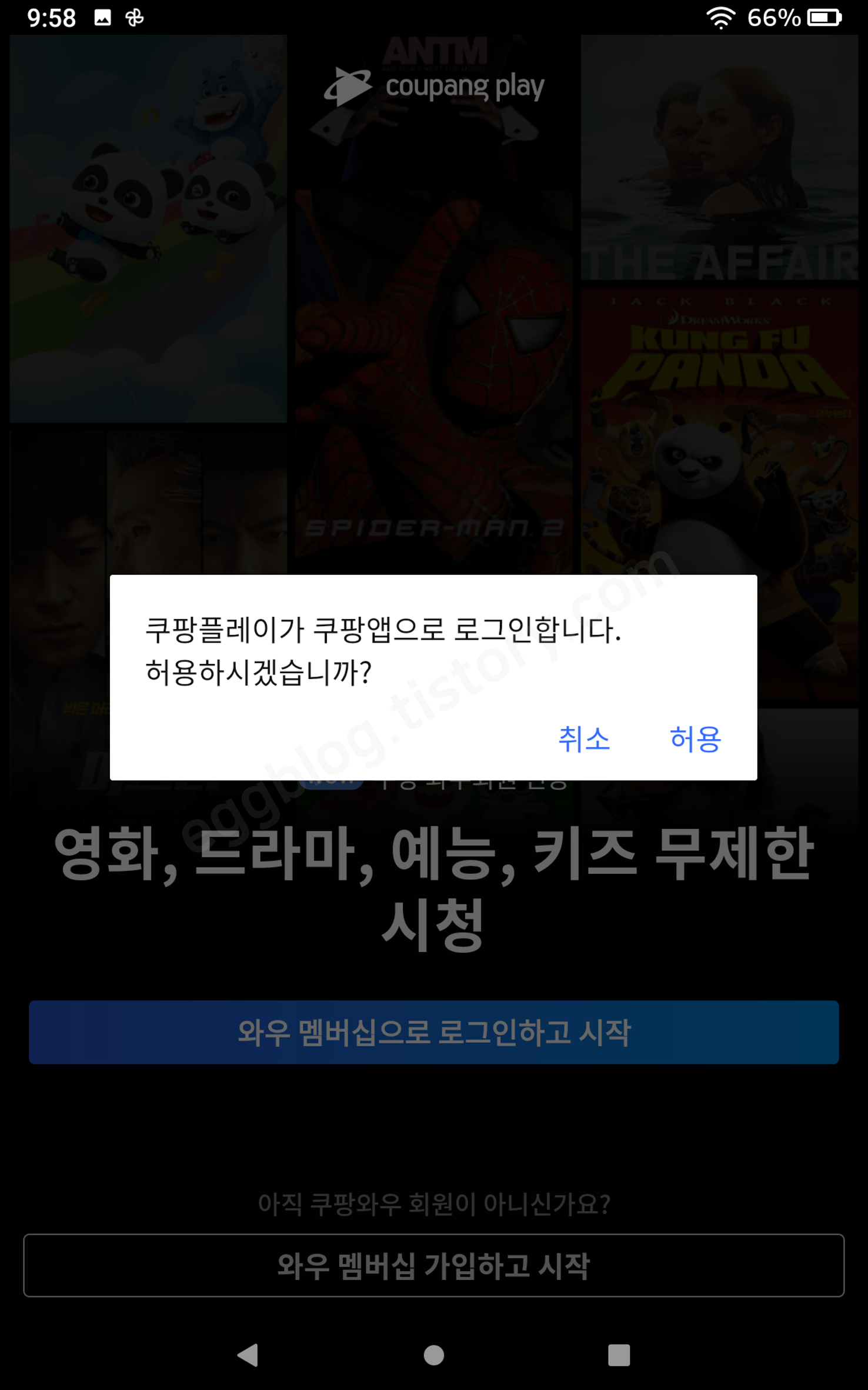 쿠팡 플레이를 설치 후 기존 회원은 쿠팡 앱을 이용해서 로그인을 하면 바로 이용 가능합니다. (로켓 와우는 무료) 그리고 프로필을 생성해 줍니다. 계정당 최대 5개 생성 가능하고 어린이 유저를 위한 키즈모드 비밀번호 기능을 제공합니다.