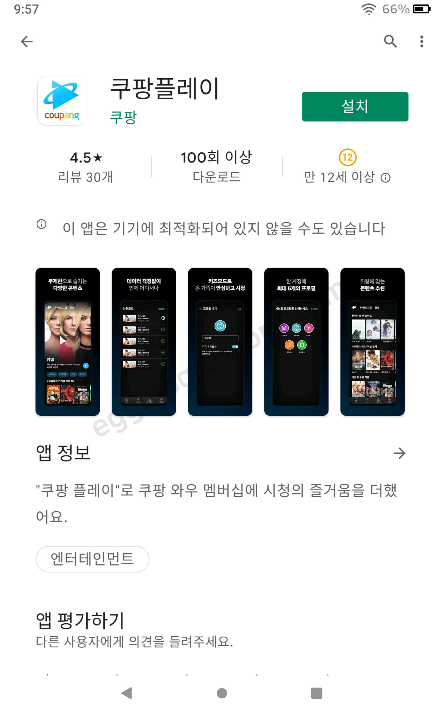반면, 오늘 출시한 쿠팡 플레이는 전반적으로 컨텐츠가 부족합니다. (넷플릭스도 처음엔 똑같았습니다.) 이제 출시한 만큼 적극적인 투자를 통해서 다양한 작품을 빠르게 서비스를 했으면 좋겠습니다. 예시로 넷플릭스에는 없고 왓챠에는 있는 "체르노빌" 처럼 띵작이라고 할 수 있는 작품을 어서 빨리 서비스해주었으면 좋겠습니다.