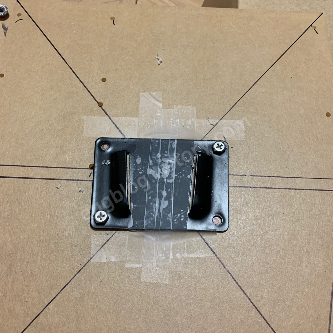 3. 브라켓을 고정하기 위해서는 아크릴판에 구멍을 뚫어주는 타공 작업을 해야 합니다. 선을 그어서 중심을 찾아주고 4mm 드릴 날을 이용해서 타공 작업을 진행했으며, 사전에 준비한 볼트와 너트를 이용해서 단단하게 고정시켜주었습니다.