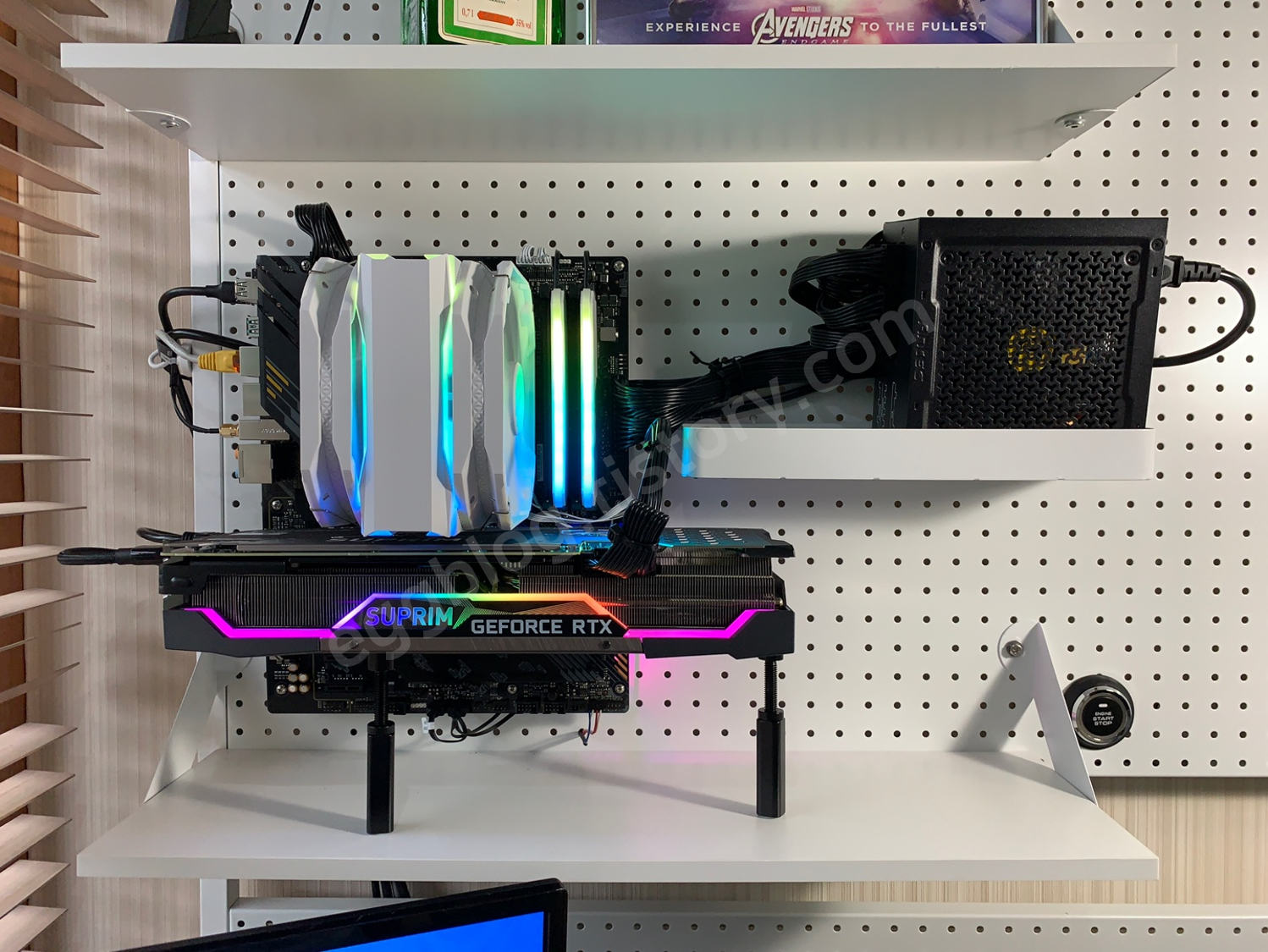 구입한 부품과 타공판 세트의 궁성품인 MDF 선반 대자를 이용해 그래픽카드 지지대와 파워를 올려놓고 어떤 식으로 진행할지 구상을 해보았습니다.