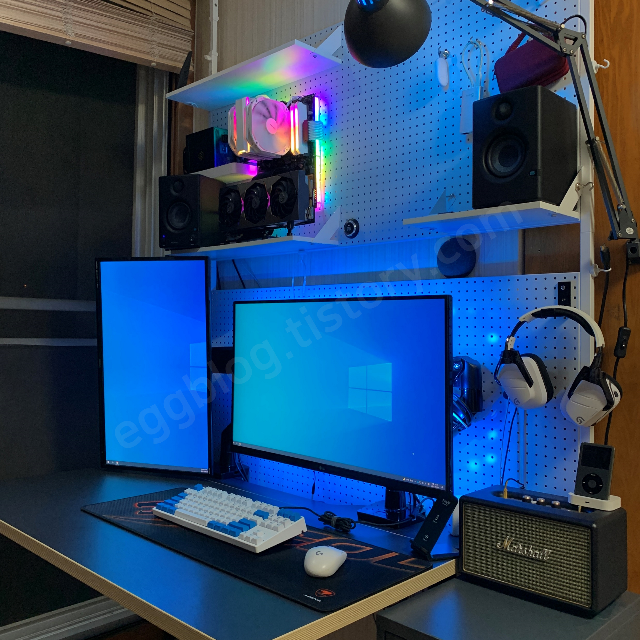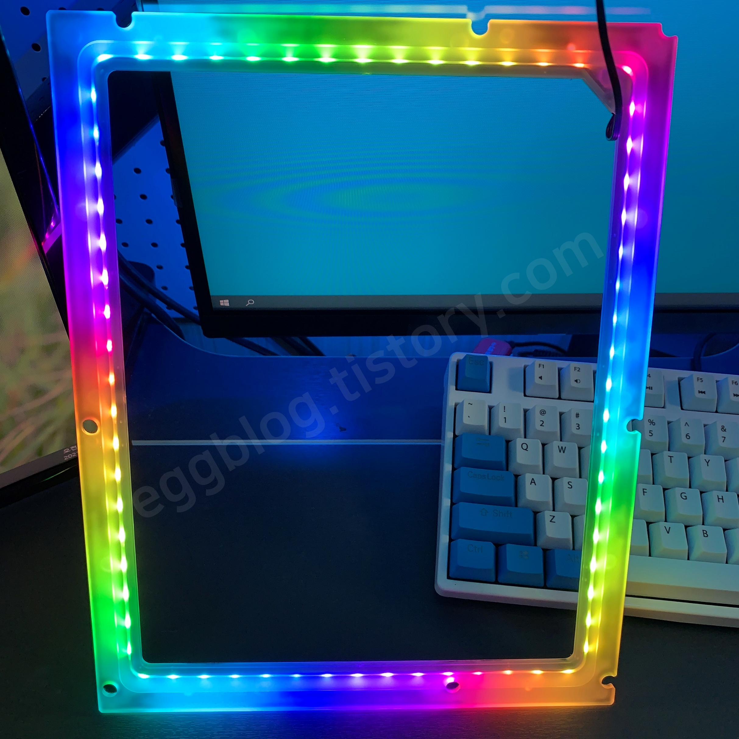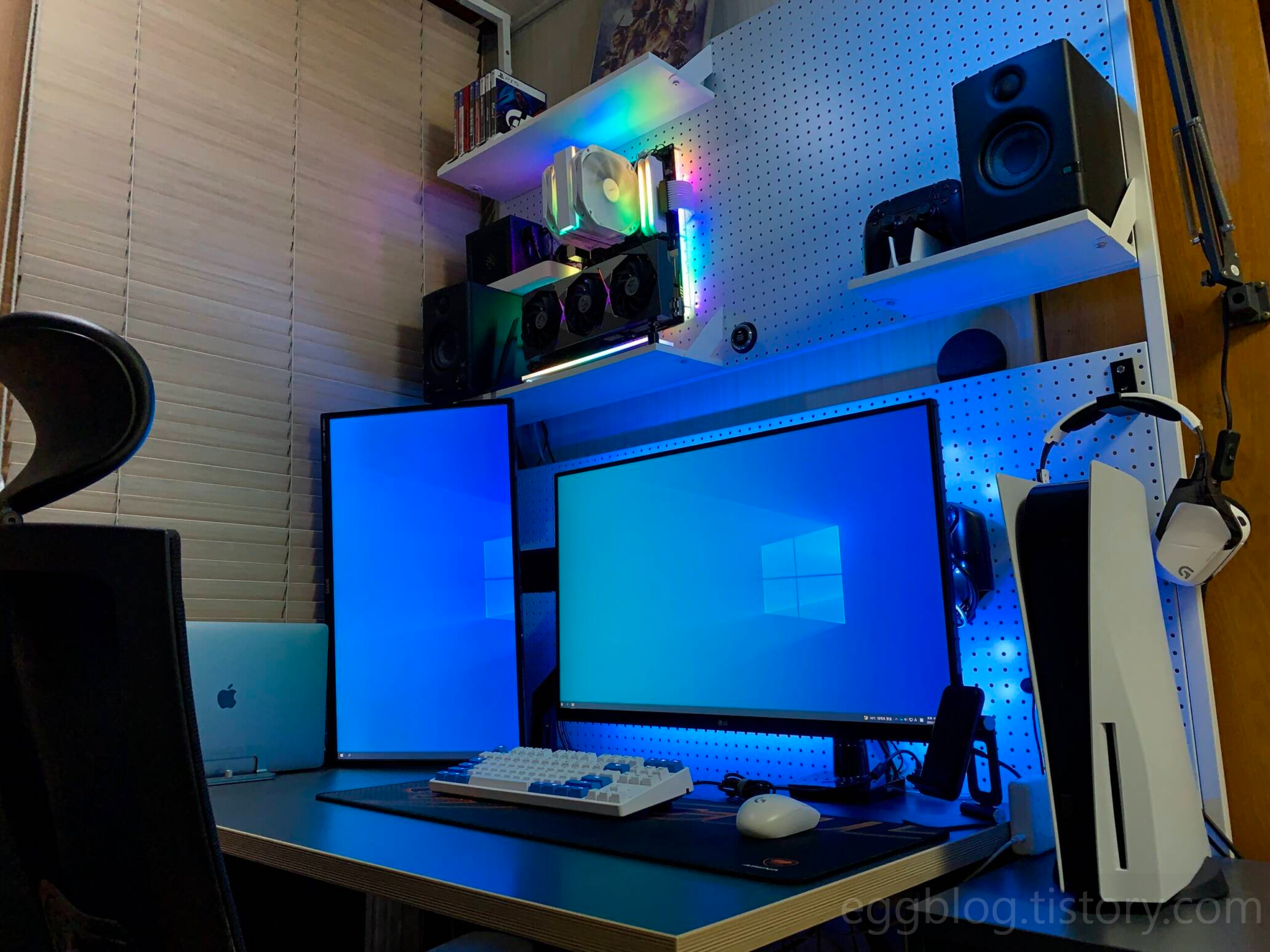 기존에 사용하던 플라스틱 수직 받침대와 달리 금속으로 된 브래킷이 주는 안정감과 LED까지 추가되어 만족도가 좋습니다. 이렇게 데스크 셋업은 마무리 되었습니다.