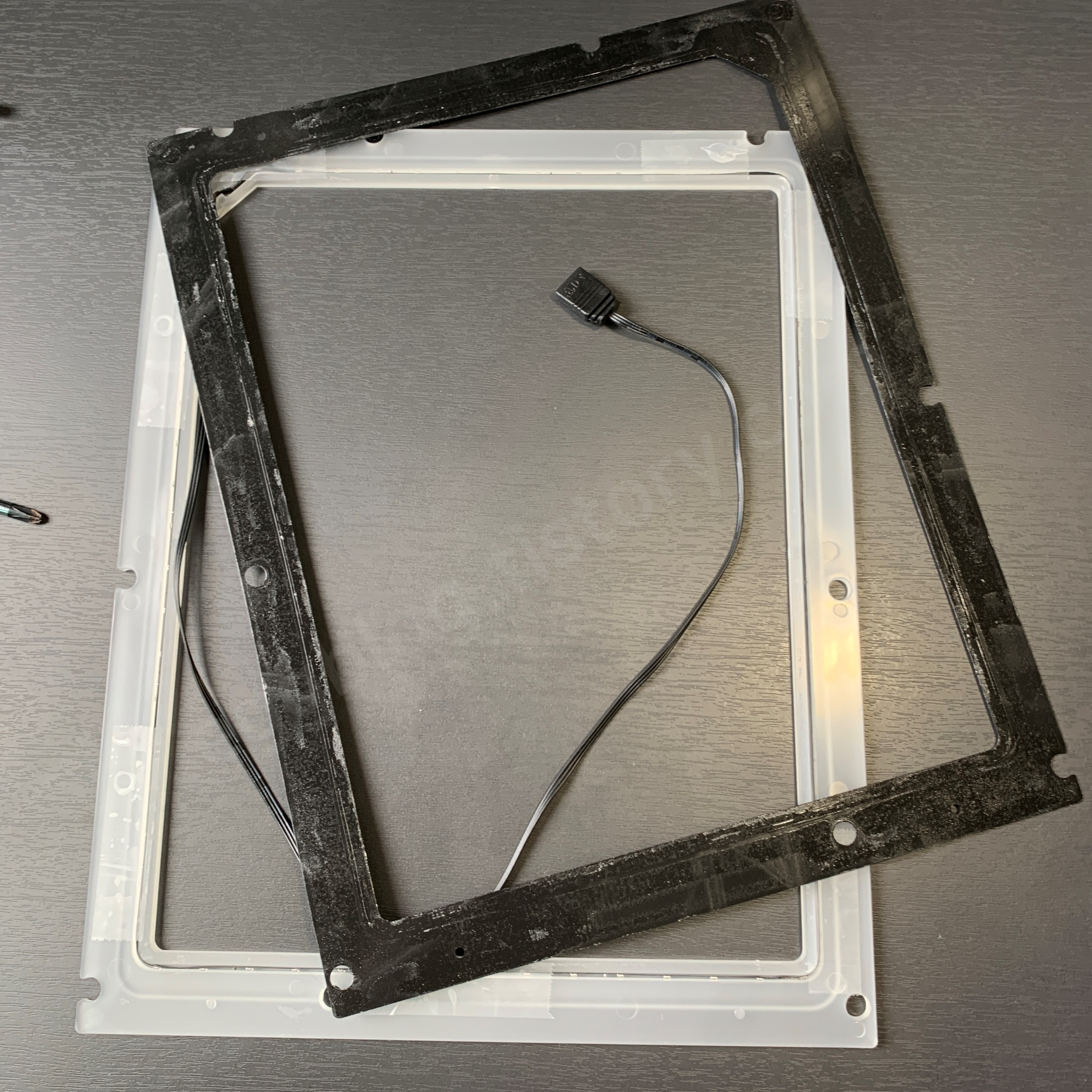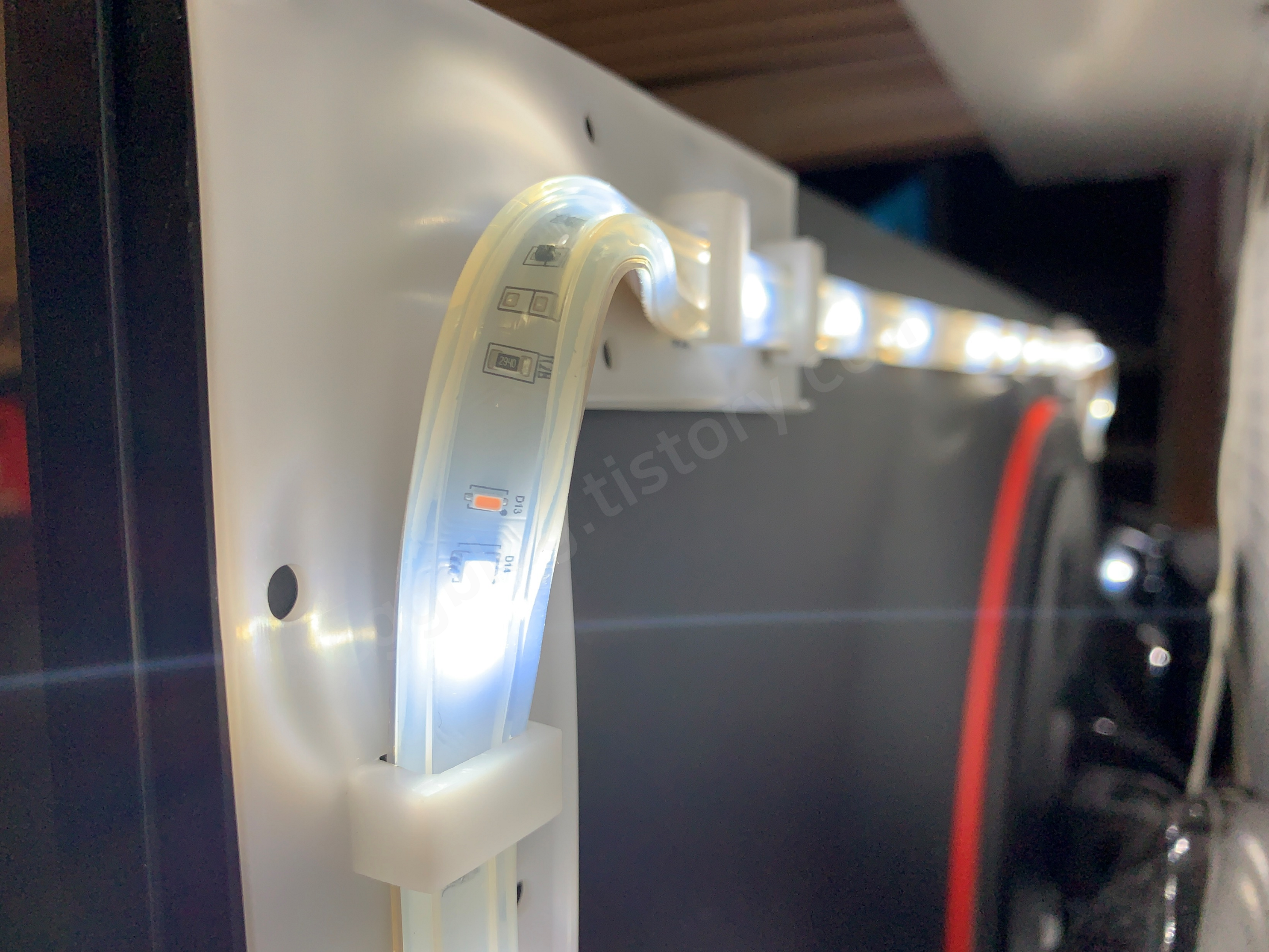 한쪽면은 LED 빛이 과도하게 산란하는 것을 방지하기 위해 두꺼운 검은색으로 된 시트지가 붙어있습니다. 하지만 시트지 그대로 사용하면 빛이 후면에만 나와 제가 원하는 광량이 안 나와서 시트지를 벗겨내고 LED 스트립은 매직테이프로 고정시켜주는 작업을 진행했습니다.