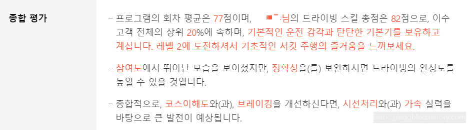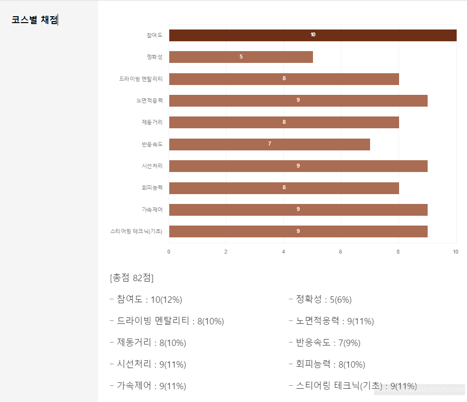 HMG 드라이빙 익스피리언스 홈페이지에 방문하여 마이페이지에 참여완료한 프로그램에 이수증과 함께 평가보기란도 있어서 내가 부족한 점은 무엇인지, 잘한 부분은 무엇인지 10가지 항목으로 평가를 하여 차트로 보여주는 디테일이 있어서 소소한 재미가 있었습니다.