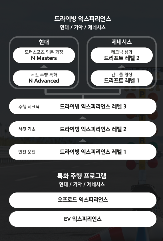 크게 EV, 오프로드, 드라이빙 3가지로 구성되어 있습니다. 그중 드라이빙 익스피리언스는 서킷 주행에 관한 전문 프로그램으로서 하위 레벨을 이수해야지 참가가 가능한 전문 교육 커리큘럼이라고 생각하시면 됩니다.