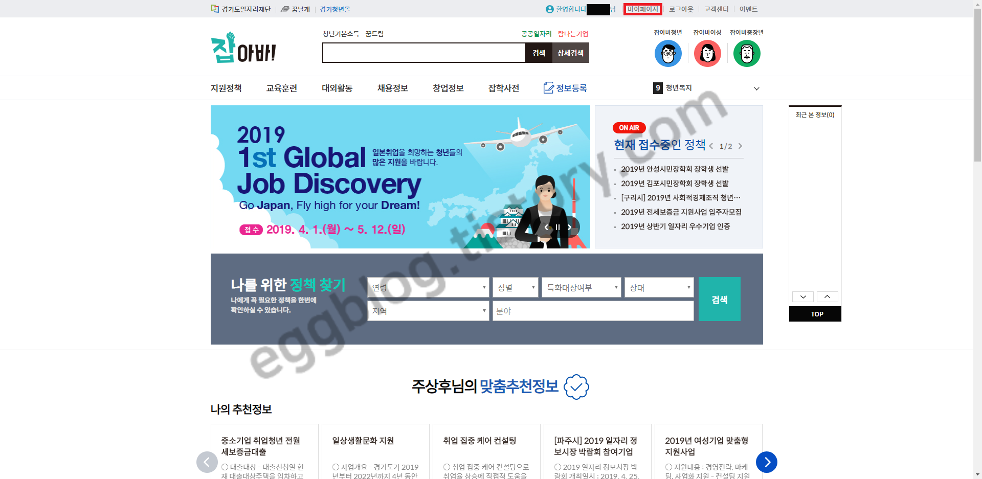 2. 잡아바 홈페이지 로그인 후 '마이페이지' 접속
