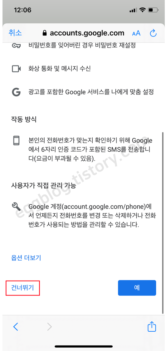 라는 페이지 최하단에 "건너뛰기" 버튼이 있습니다. 누르면 전화번호 등록이 필요없이 바로 계정 생성이 가능합니다. 또한 통신망에 따라 해당 화면이 다른 경우가 있다고합니다. 똑같은 화면이 안나온다면 wifi 상태 혹은 다른 통신망에서 시도해주세요.