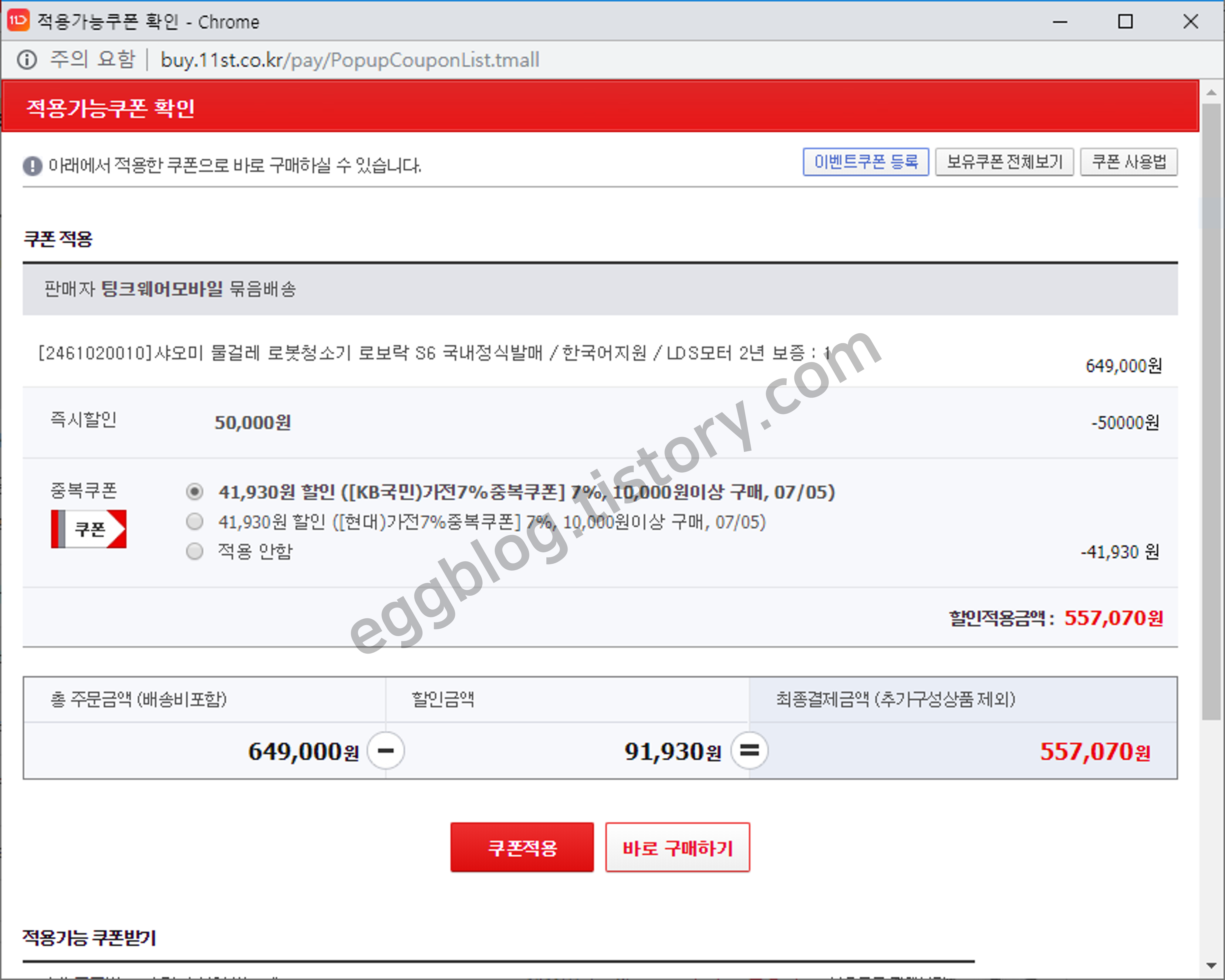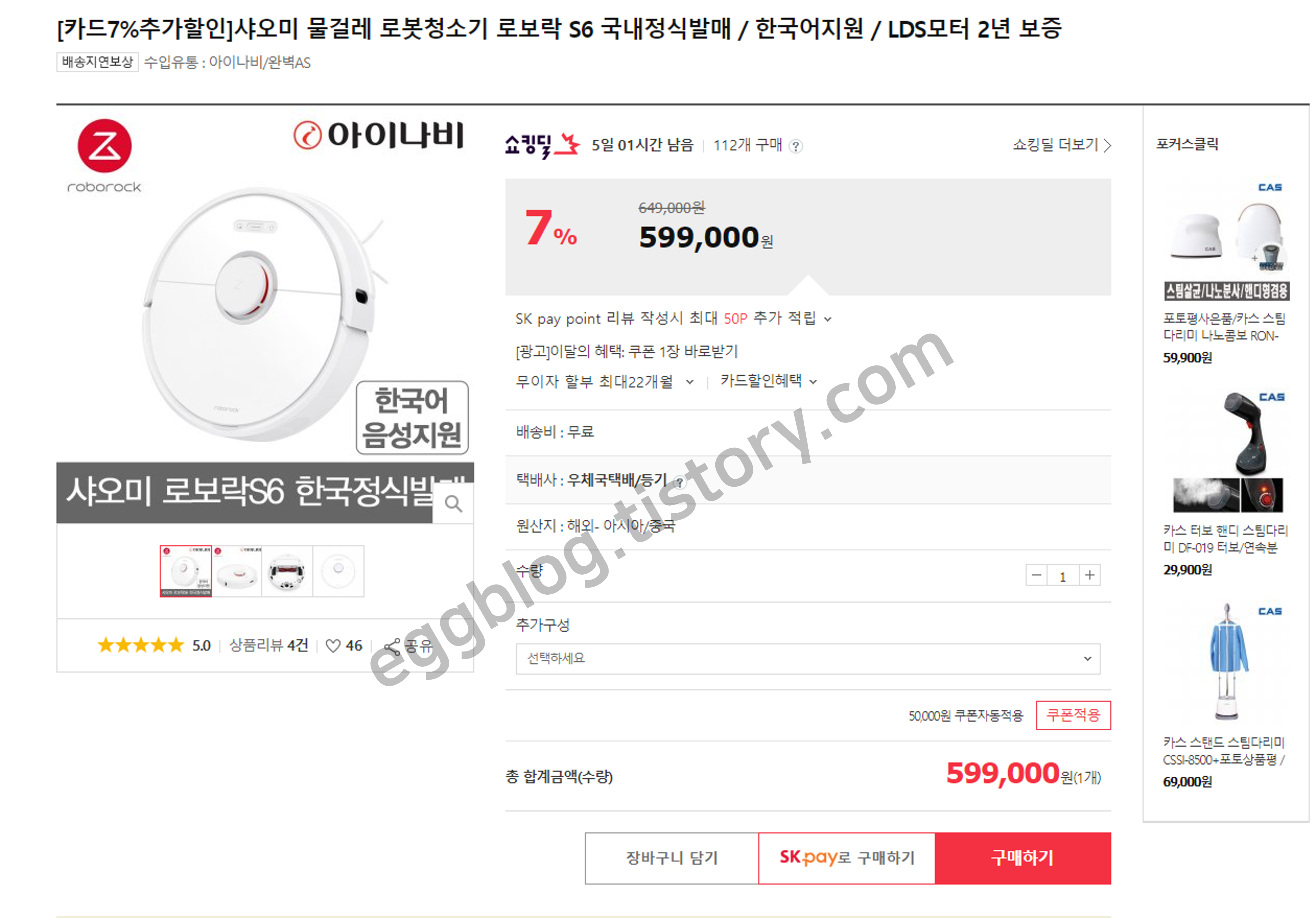 현재 복지포인트를 사용 가능한 쇼핑몰 중 로보 락 S6를 판매하는 곳은 11번가가 유일해서 11번가에서 구입했습니다.