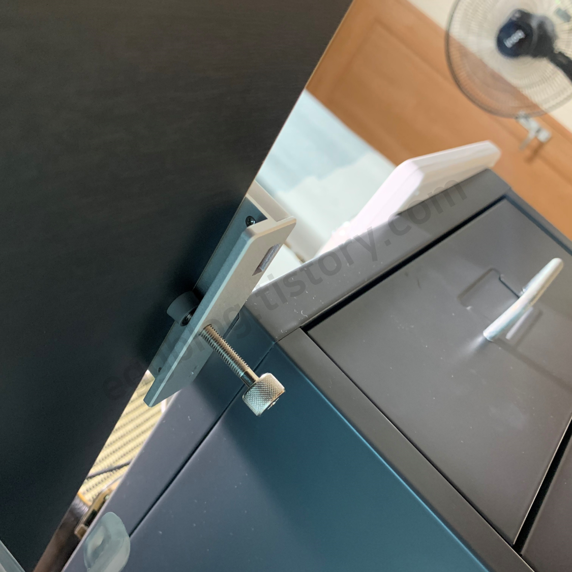 책상, 모니터와 같은 옆면에 손나사를 돌려서 고정시켜주시면 쉽게 설치가 가능합니다.