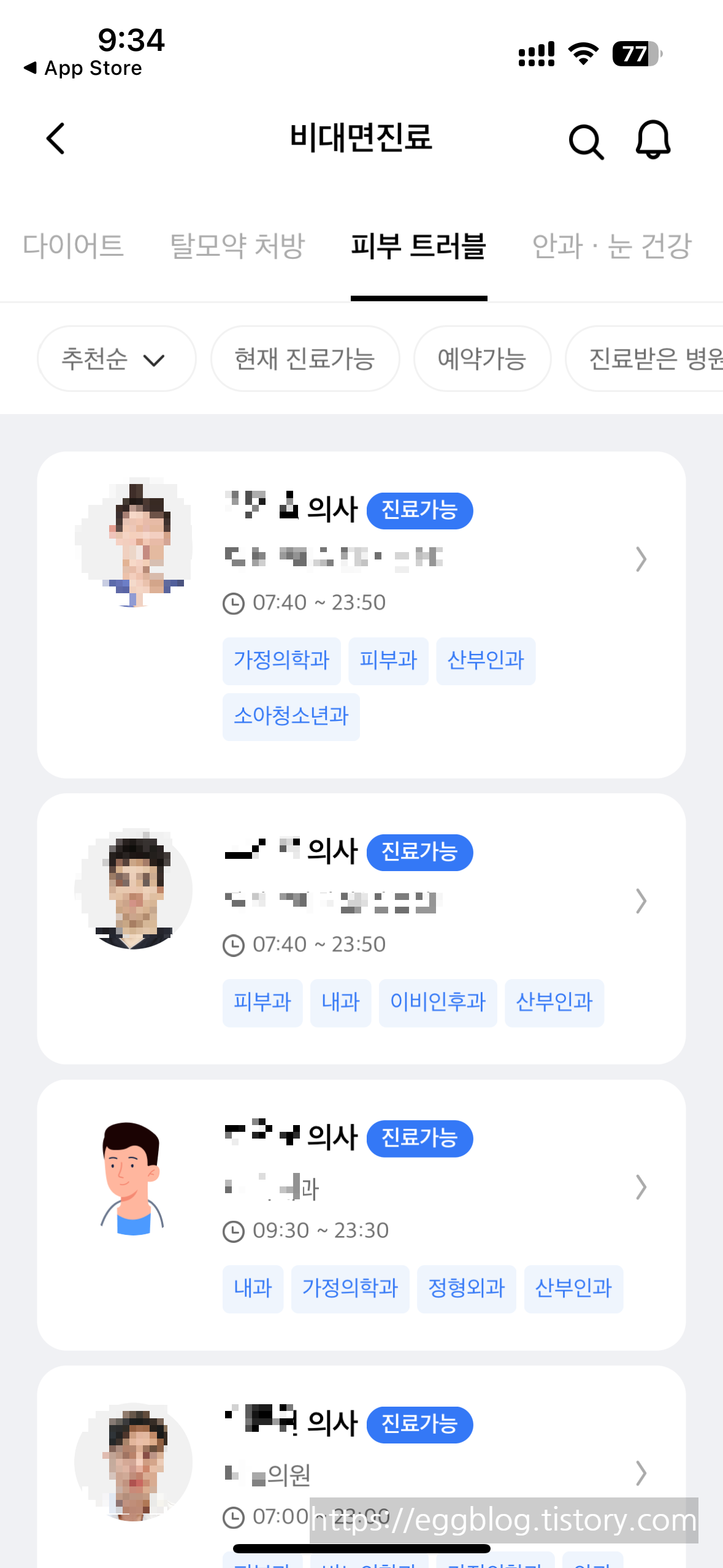 비대면 진료답게 전국에 계신 의사 선생님 리스트가 나오며 진료시간에 맞춰서 진료가능, 예약가능으로 표시됩니다.