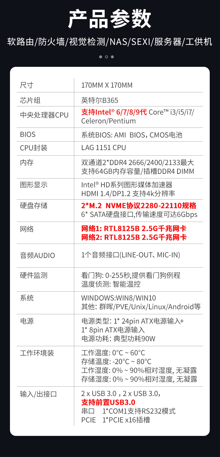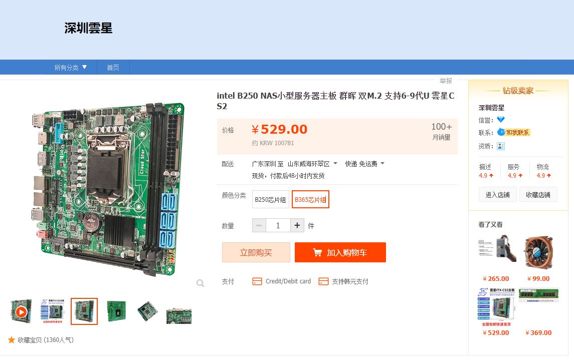B365 메인보드 역시 타오바오에서 구매했으며, 직배송이 가능한 제품이라 555위안 (약 105,000원)이 들었으며, M.2 2개, SATA 6개, 듀얼랜 (2.5G) 포트를 지원하는 훌륭한 NAS용 메인보드입니다.