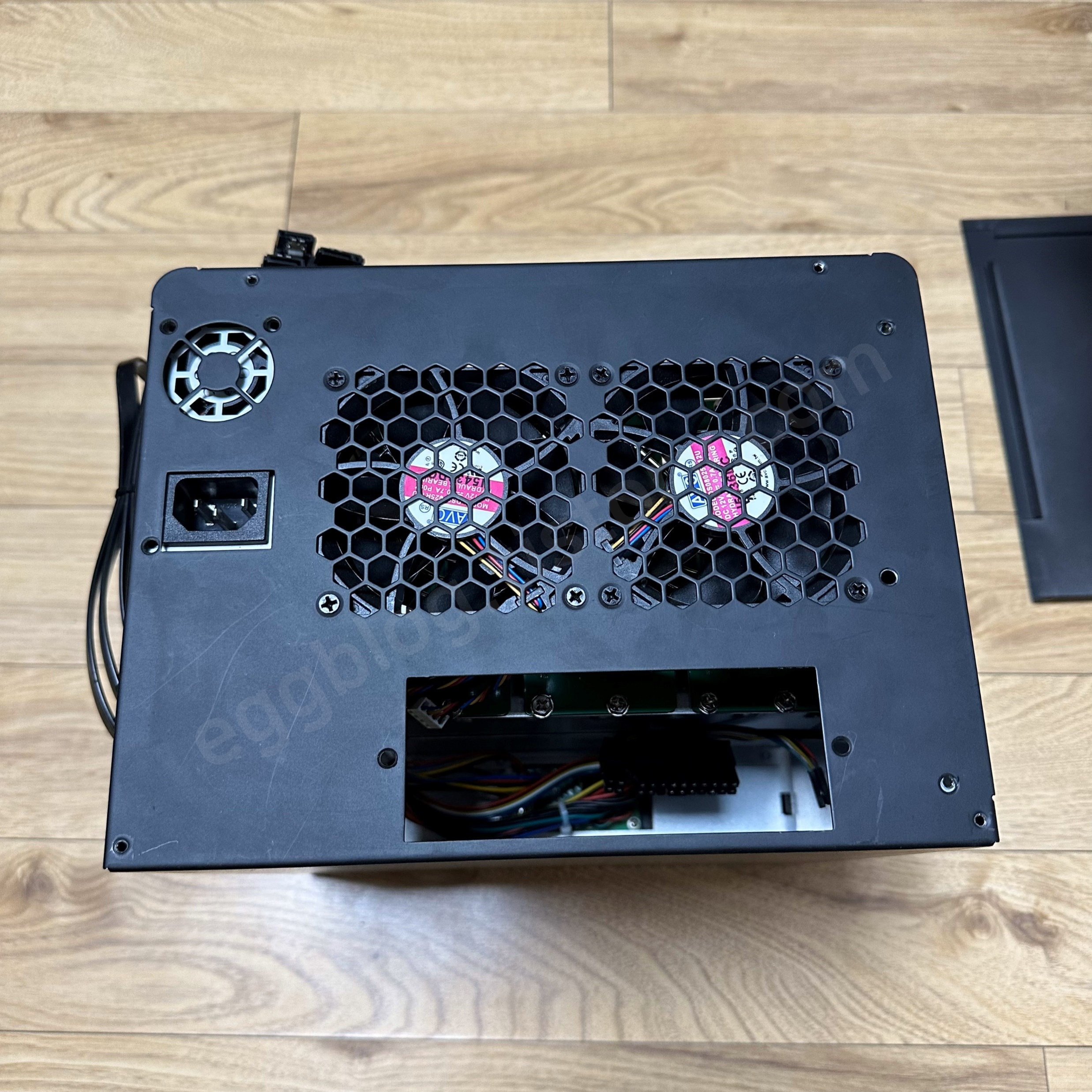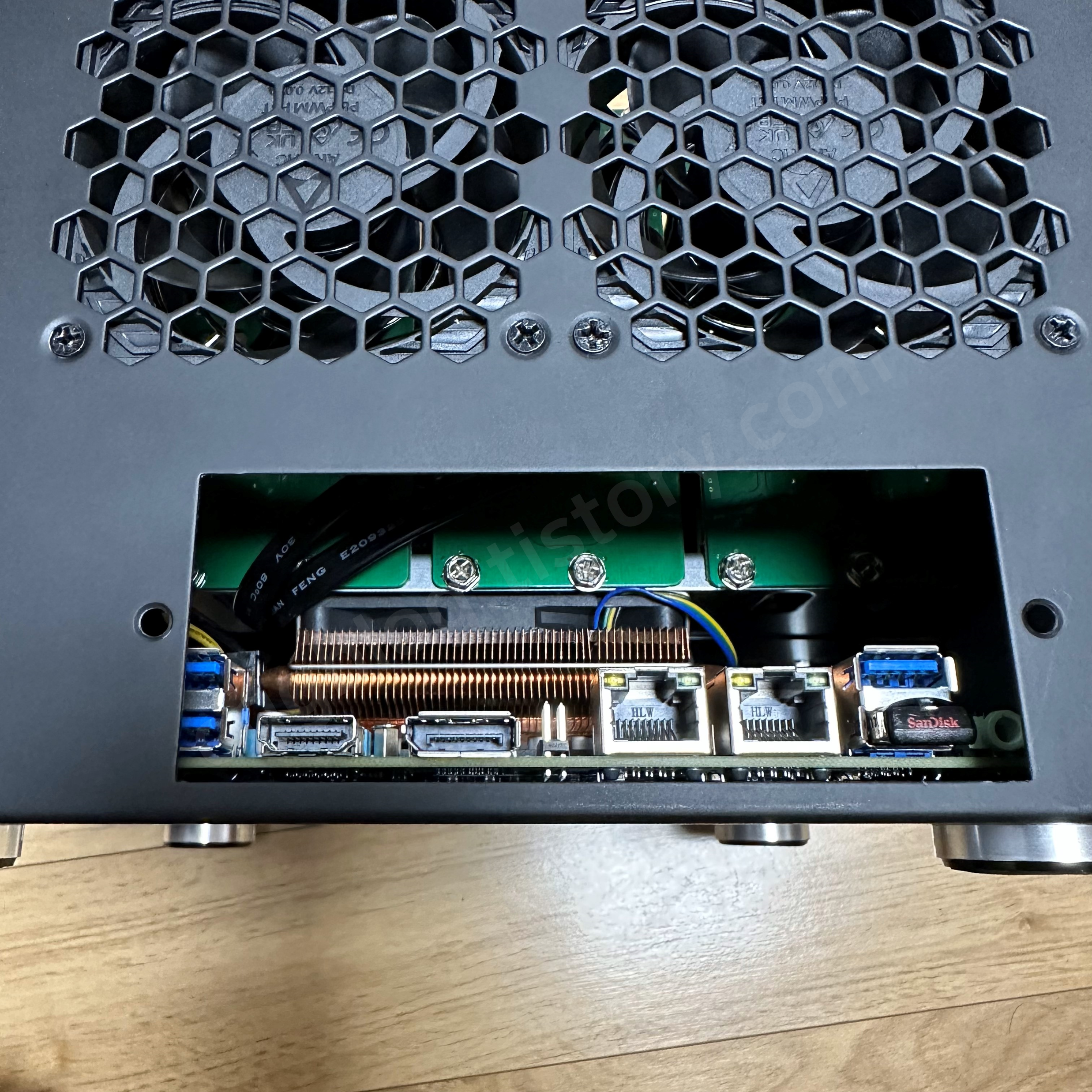 케이스의 문제점은 사진과 달리 후면 백패널이 이상한 규격입니다. mitx보드를 넣으면 좌우가 좁아 가리게 되고 사진과 같이 그냥 구멍 뚫린 상태로 사용해야 하는 치명적인 단점이 있으며, 쿨러 높이가 매우 제한적입니다. 기존에 사용하던 써모랩 ITX30가 높이가 30mm인 제품인데 딱 맞는 상태라 다소 불안하지만 대안이 없는 상황도 단점입니다.